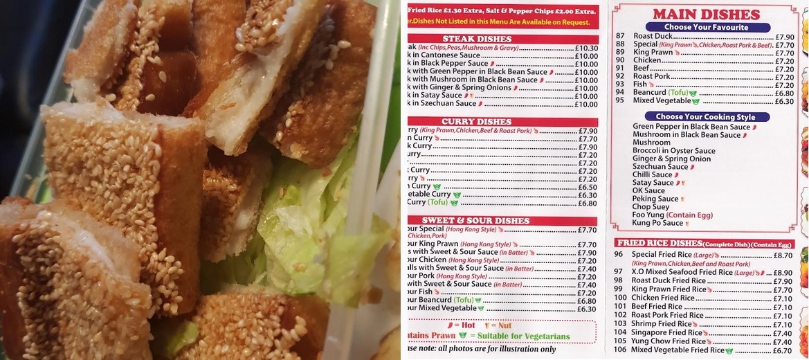 Tried it Friday 23rd May after reading the reviews. Ordered Spare Ribs in OK sauce, lots of meat on them and a generous portion in a very tasty sauce. Singapore Vermicelli, another generous portion packed with flavour and just the right amount of spice with lots of tasty prawns. Fillet Steak with ginger and spring onions, will set your tastebuds alight. Lots of freshly sliced ginger and onion and enough spice so as not to take away from the ginger. The slices of steak were so tender and tasty that a knife wasn’t required and they were not shy on the amount of steak in the dish. (Highly recommend) Ordered a side dish of fried broccoli in Oyster sauce which I couldn’t fault, so fresh and nice. I was told it would be 45 mins to 1 hour. To my surprise less than 30 mins after ordering it arrived, pipping hot along with prawn crackers and some mini spring rolls on the house. Well done guys, we’ll be ordering again soon. All in £33 inc delivery. 👏🏻