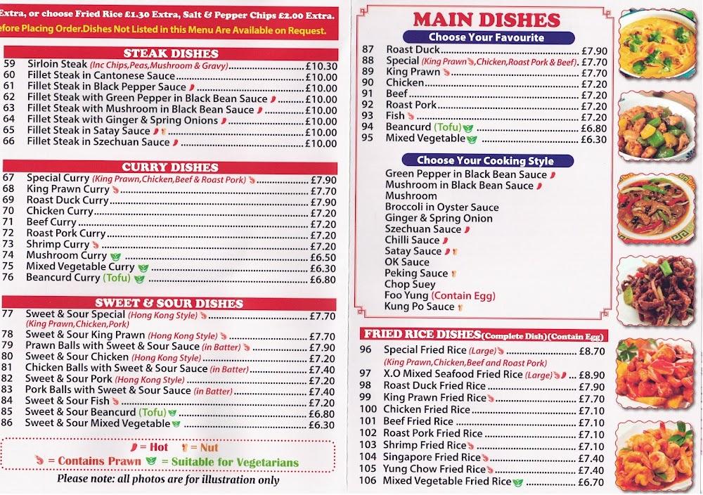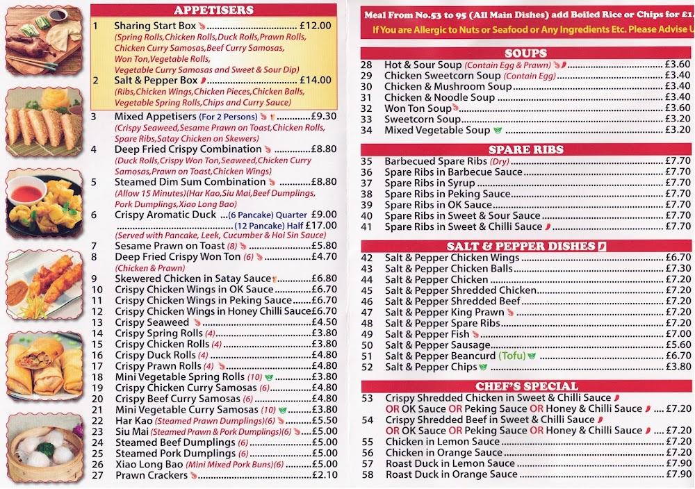 Crispy Aromatic Duck (For 4), Mixed Appetisers (For 4), Fillet Steak in Cantonese Sauce, Shredded Chicken in Sweet Chilli Sauce, King Prawn with Ginger & Spring Onion, Roast Pork in Szechuan Sauce, Yung Chow Fried Rice